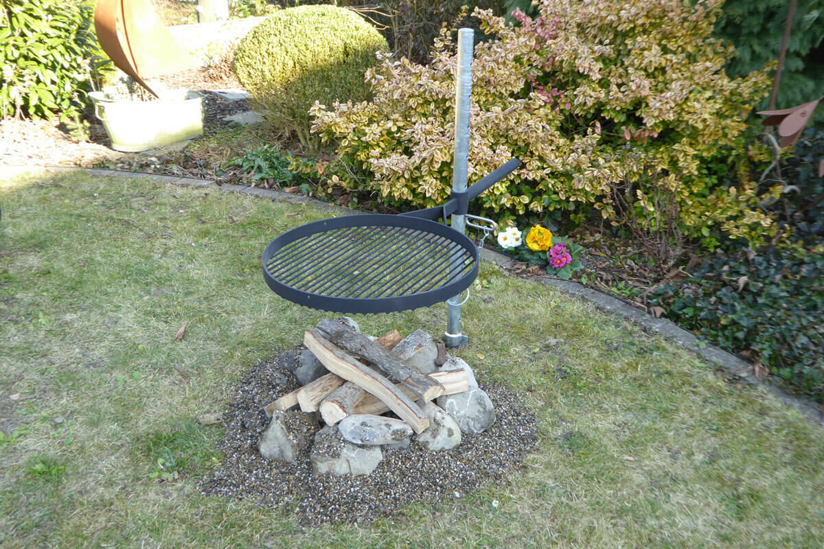 Aufbau wie bei öffentlichen Grillplätzen draussen in der Natur. Höhenverstellbar mit Dorn, Standrohr und Bodenhülse in feuerverzinktem Stahl.